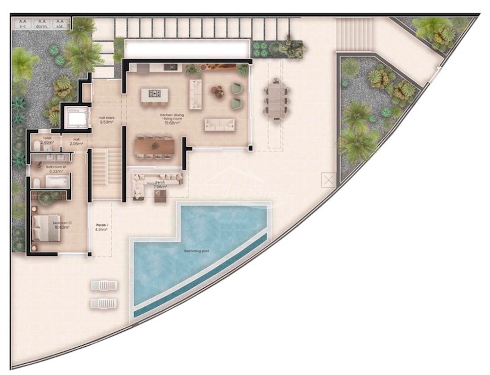 La propiedad se asienta sobre una parcela privada de aproximadamente 500 m² y cuenta con más de 300 m² construidos, distribuidos en tres niveles: planta principal, planta superior y planta inferior. Dispone de tres dormitorios en suite, uno o dos de ellos con vestidor, una cocina abierta integrada en el salón y un aseo de cortesía en la planta principal.