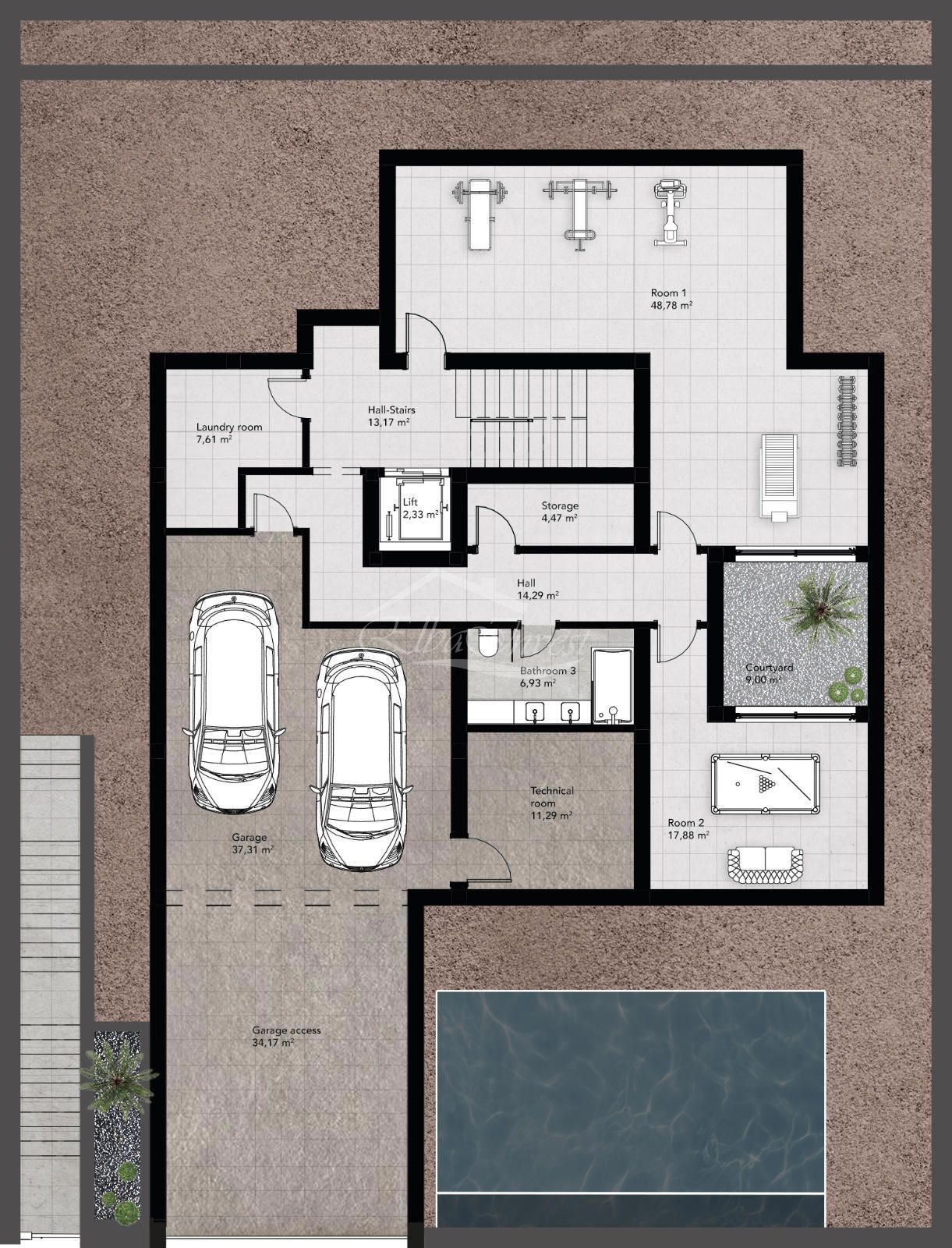 La planta inferior, con iluminación natural, ofrece estancias polivalentes, ideales como gimnasio, despacho, sala de cine o zona de ocio, además de un baño adicional, lavandería, sala técnica y espacios de almacenamiento.