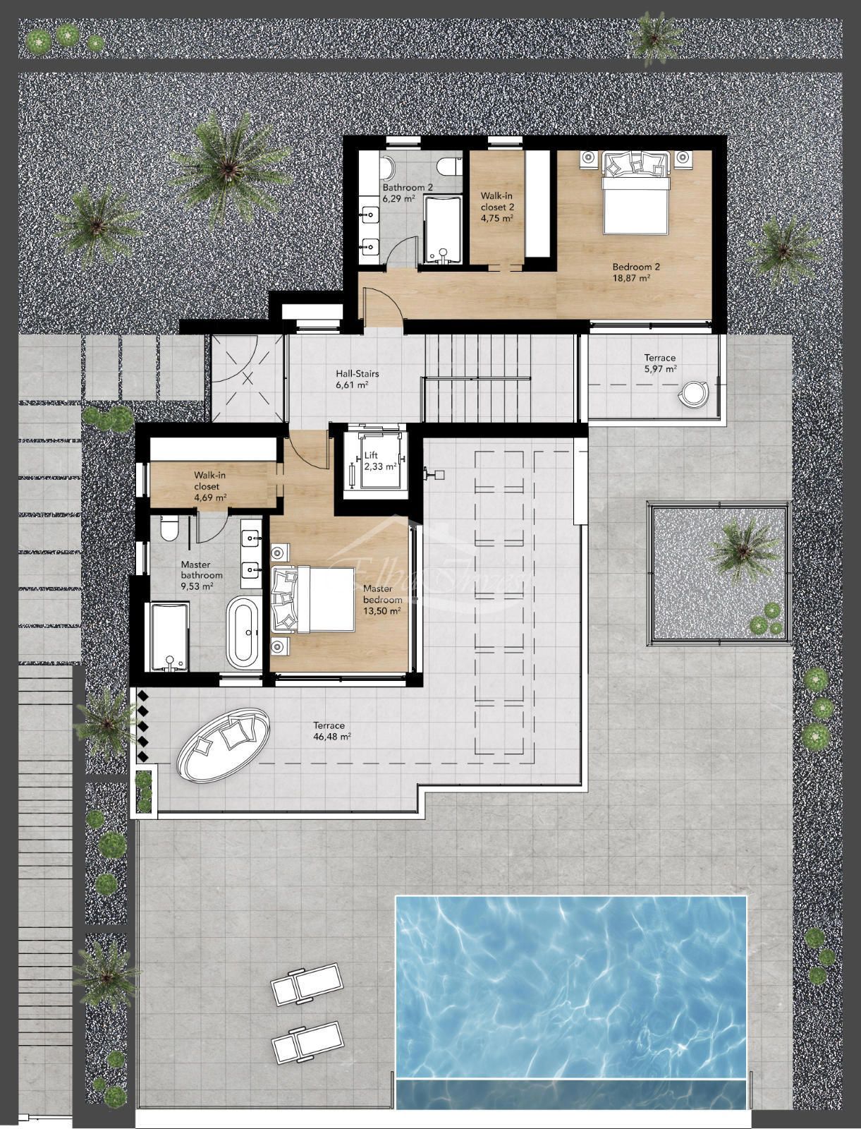 La propiedad se asienta sobre una parcela privada de aproximadamente 500 m² y cuenta con más de 300 m² construidos, distribuidos en tres niveles: planta principal, planta superior y planta inferior. Dispone de tres dormitorios en suite, uno o dos de ellos con vestidor, una cocina abierta integrada en el salón y un aseo de cortesía en la planta principal.