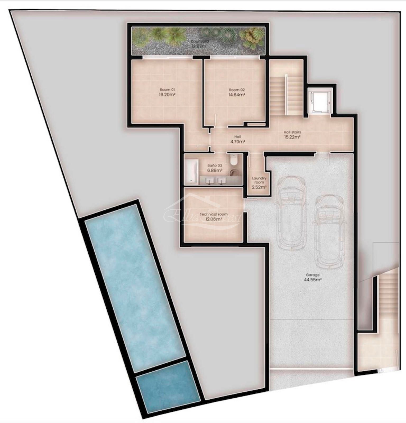 La planta inferior, con iluminación natural, ofrece estancias polivalentes, ideales como gimnasio, despacho, sala de cine o zona de ocio, además de un baño adicional, lavandería, sala técnica y espacios de almacenamiento.