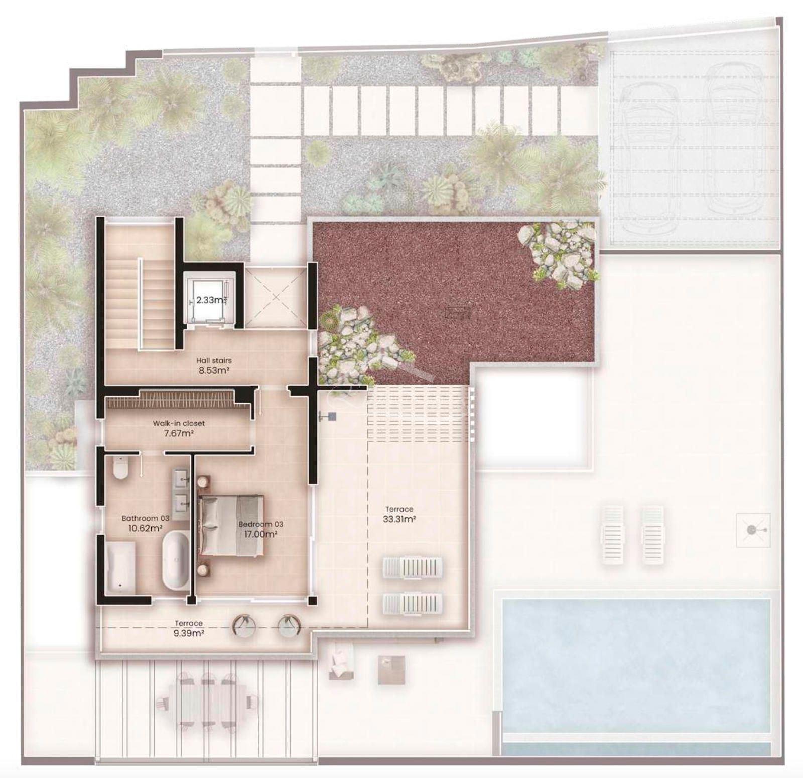 La propiedad se asienta sobre una parcela privada de aproximadamente 500 m² y cuenta con más de 300 m² construidos, distribuidos en tres niveles: planta principal, planta superior y planta inferior. Dispone de tres dormitorios en suite, uno o dos de ellos con vestidor, una cocina abierta integrada en el salón y un aseo de cortesía en la planta principal.