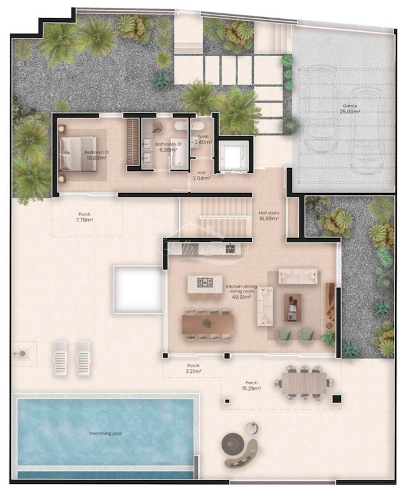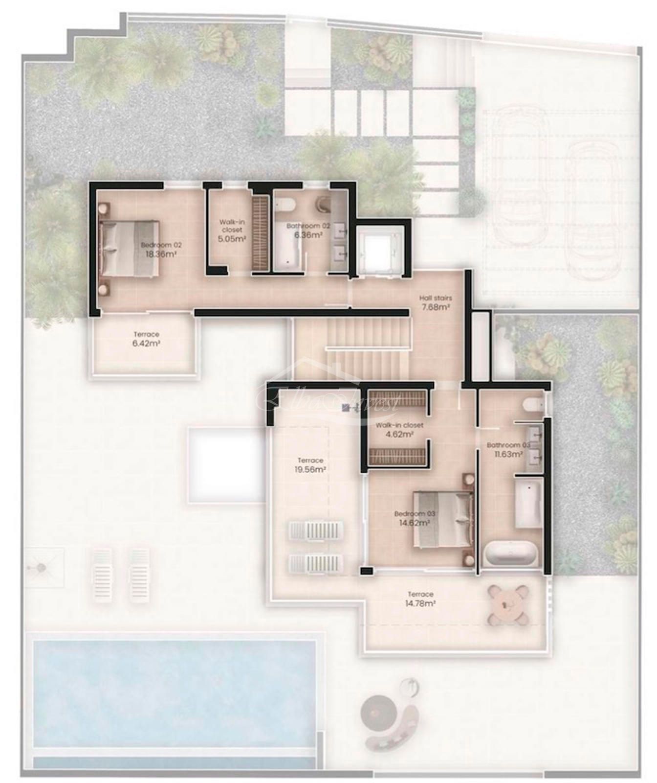 La propiedad se asienta sobre una parcela privada de aproximadamente 500 m² y cuenta con más de 300 m² construidos, distribuidos en tres niveles: planta principal, planta superior y planta inferior. Dispone de tres dormitorios en suite, uno o dos de ellos con vestidor, una cocina abierta integrada en el salón y un aseo de cortesía en la planta principal.