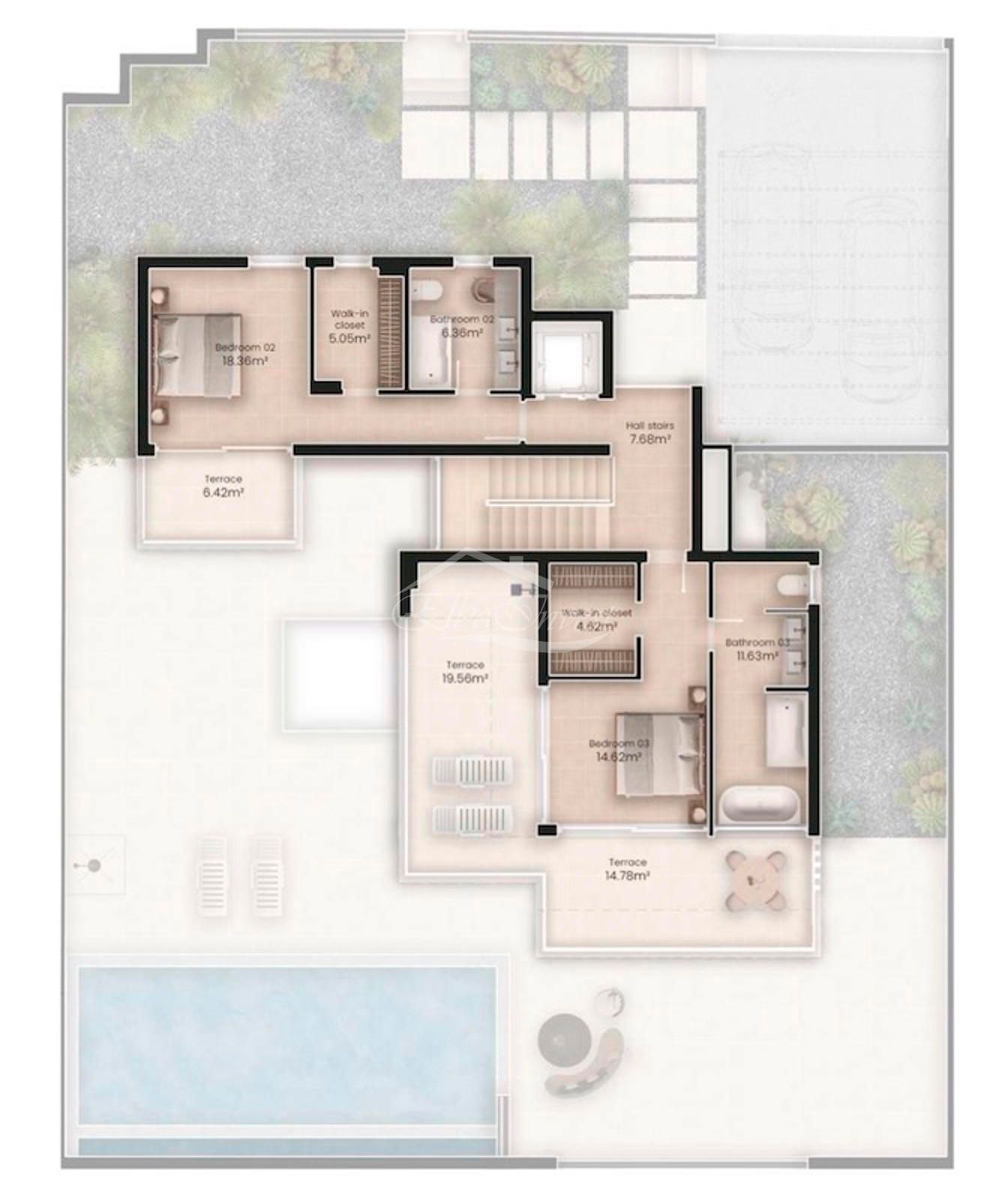 La propiedad se asienta sobre una parcela privada de aproximadamente 500 m² y cuenta con más de 300 m² construidos, distribuidos en tres niveles: planta principal, planta superior y planta inferior. Dispone de tres dormitorios en suite, uno o dos de ellos con vestidor, una cocina abierta integrada en el salón y un aseo de cortesía en la planta principal.