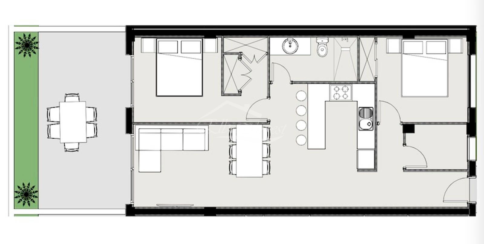Esta magnífica vivienda se distribuye en un amplio y luminoso salón comedor con cocina de concepto abierto, 2 dormitorios, 1 baño completo y una generosa terraza/jardín, perfecta para disfrutar del aire libre durante todo el año.