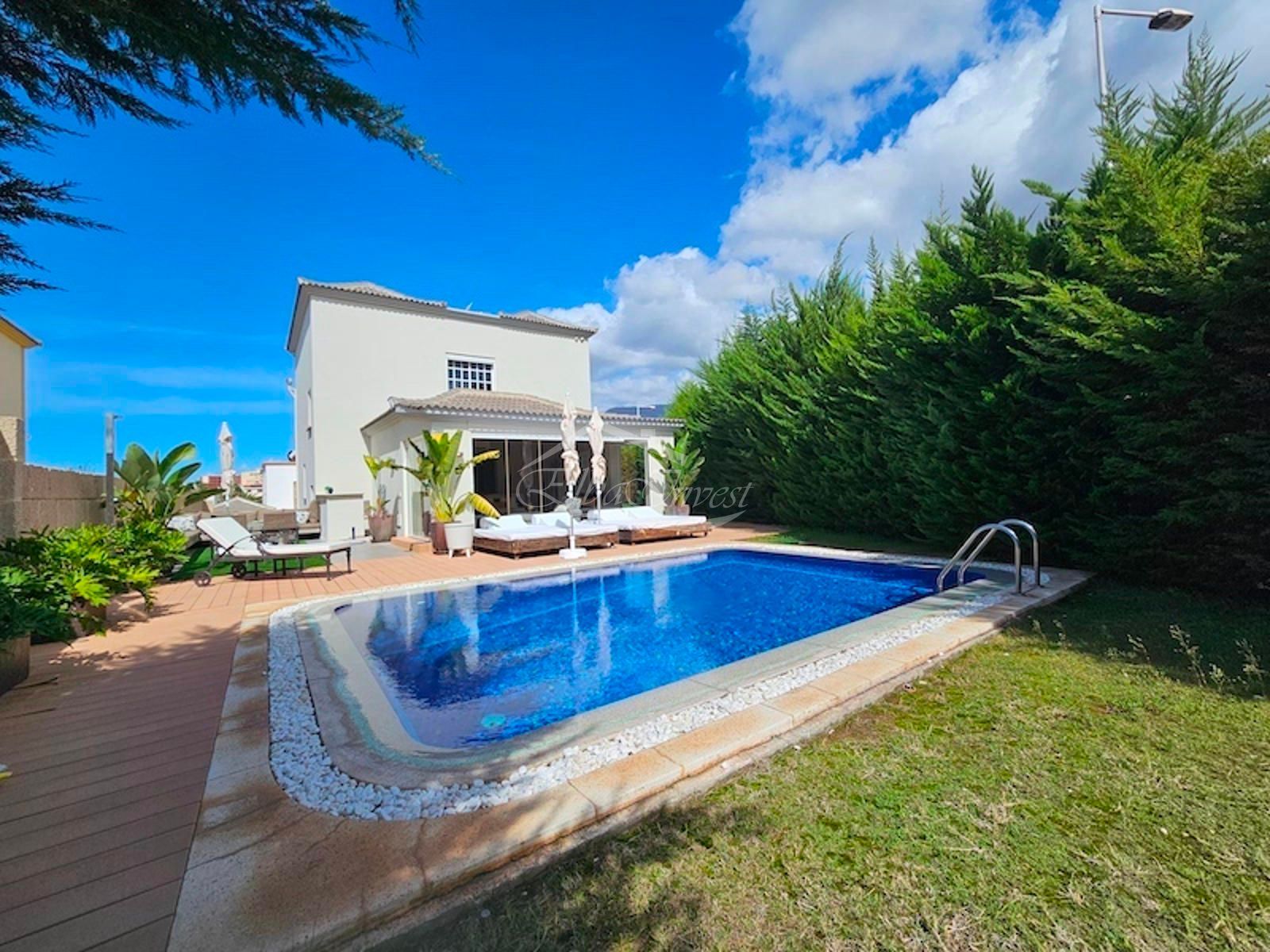 Magnifique villa de luxe à vendre à Costa Adeje avec vue panoramique sur l’océan, le golf et l’île de La Gomera. Cette somptueuse villa de luxe est située sur un terrain de 720 m². La surface construite, incluant terrasses, porches et sous-sol, est de 515 m².